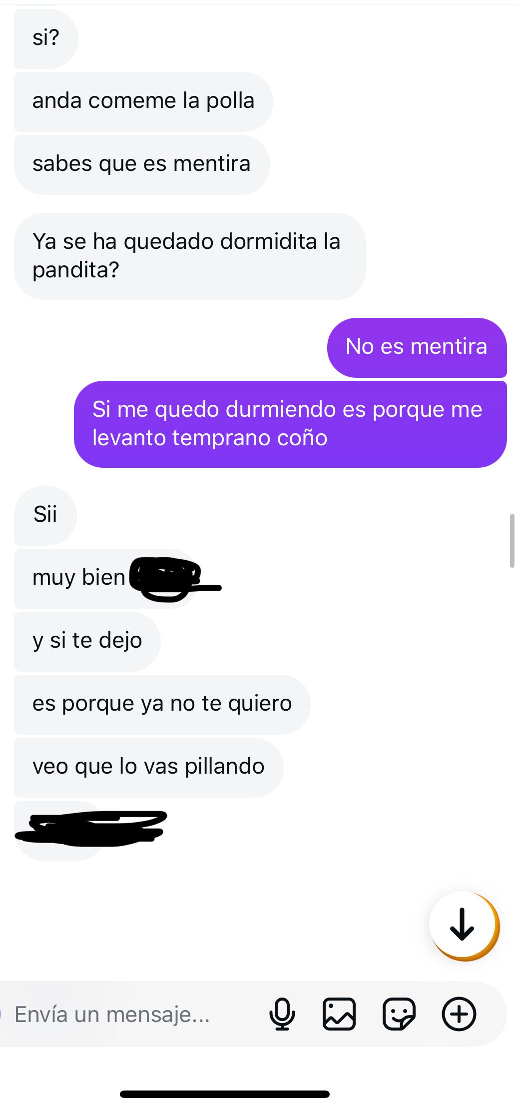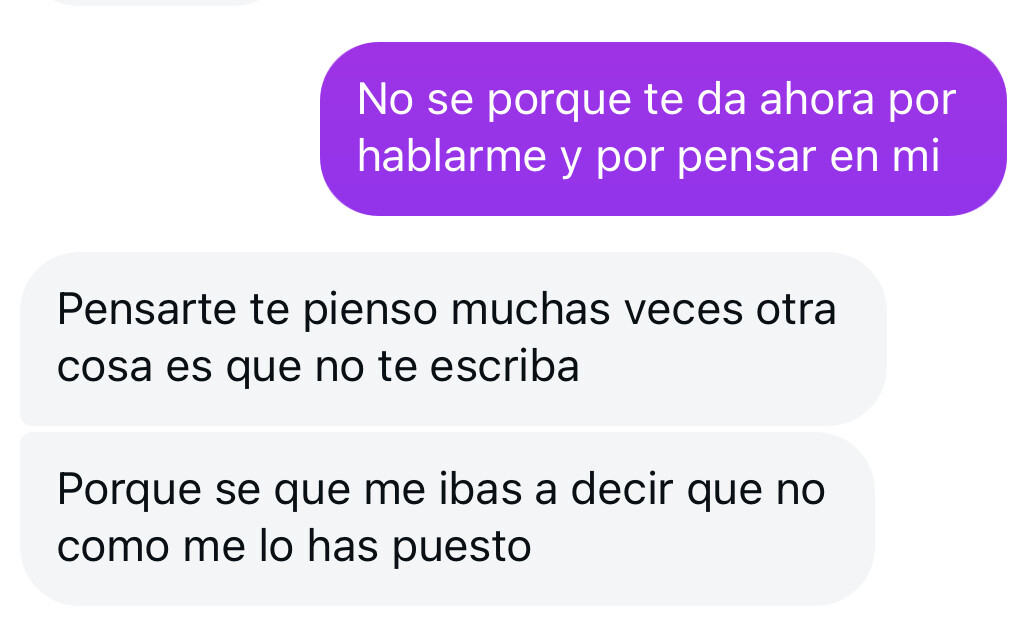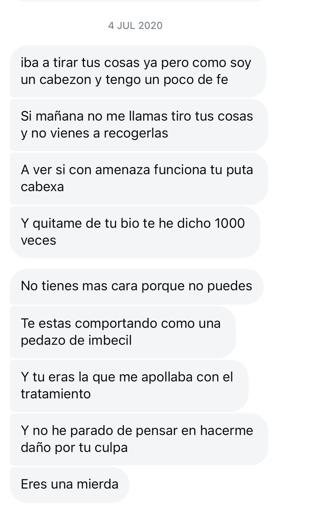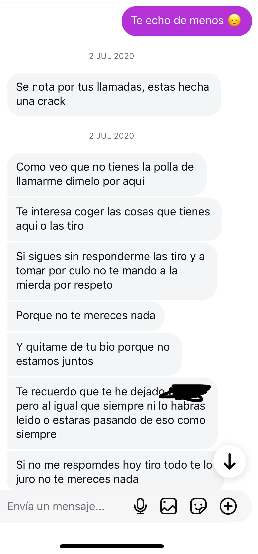 Cuando llegó el COVID, apenas hablábamos..más por mi parte, por lo tanto lo dejamos. Tenía que cuidar a mi abuelo, que estaba muy mal. Además, tenía clases online del FP y mandaban más deberes de lo normal. Bueno, pues como yo no le respondía, lo que hacía era soltarme gilipolleces y después me bloqueaba. Y yo como una subnormal, le hablaba por Instagram y le rogaba que me desbloqueara. Me amenazó con que si no le respondía iba a tirar todas mis cosas que tenía allí. Spoiler: las tiró. El se pensaba que yo le había puesto los cuernos, cosa que no fue así.