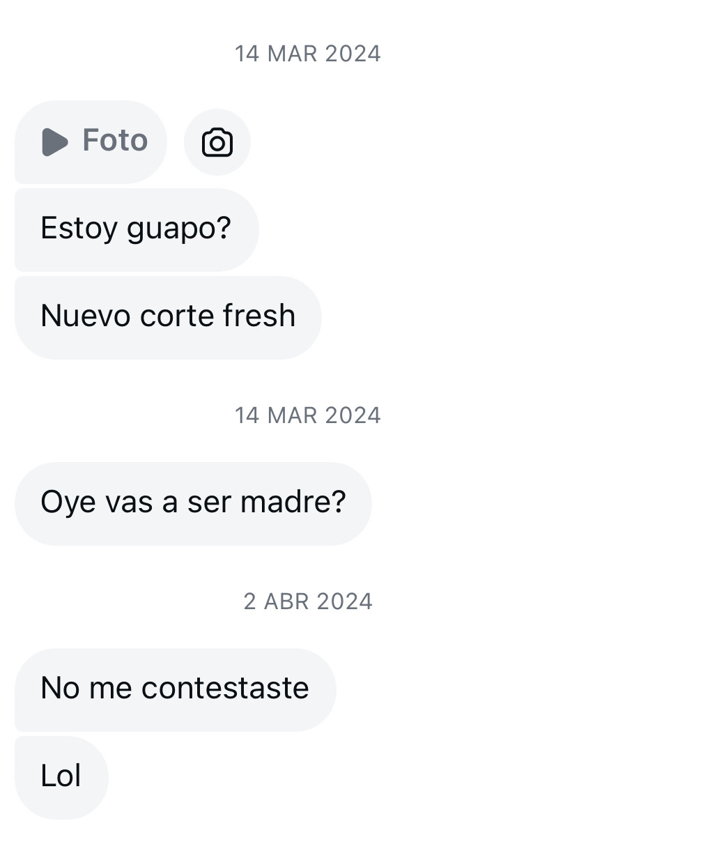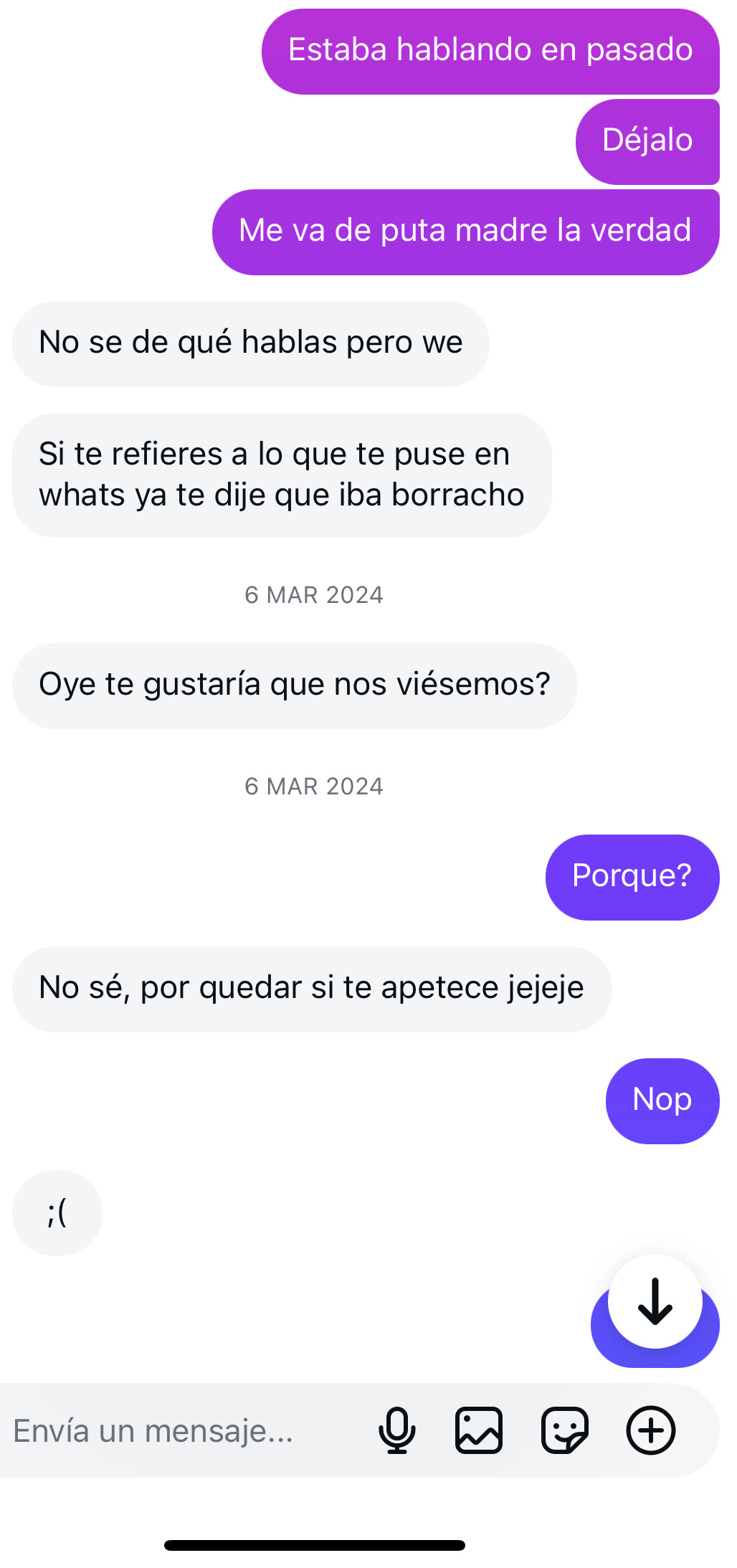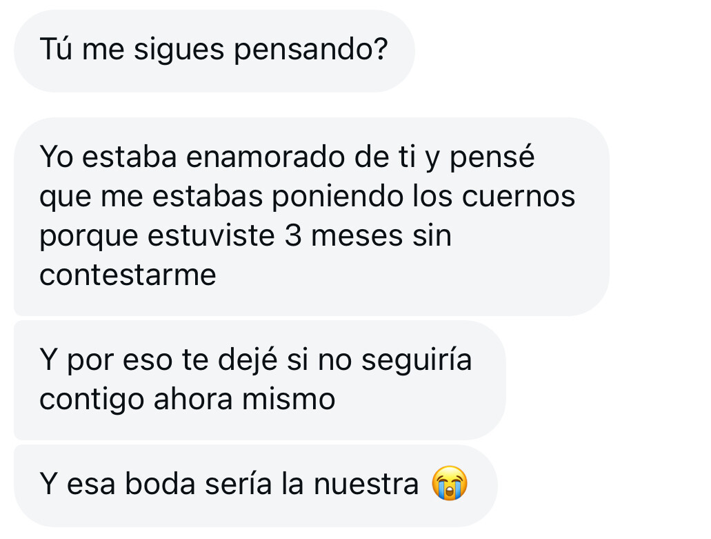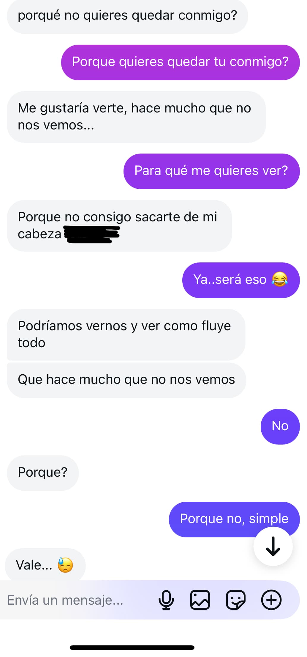 Conversaciones sin sentido, diciéndome que pensaba que yo le había puesto los cuernos y por eso me había dejado. Que podíamos haber sido nosotros los que tuvieran un bebé (subí una foto de unos pies de un bebé y él respondió a la historia y dio por echo de que era mi hijo, le seguí el juego solo para ver que decía). Le dije que me dejara en paz que ya tenía mi vida reecha, que me iba a casar (no era cierto) y dijo que tenía que haber sido con el, que todo era mi culpa porque él pensaba que yo le había puesto los cuernos (seguía con esas), y así todo el rato. Cada cierto tiempo aparece, y ya estoy hasta los cojones. El tiene su pareja y sigue pendiente de mí, no entiendo porque. Y yo tengo mi pareja y un futuro por delante con el, y soy feliz con el.