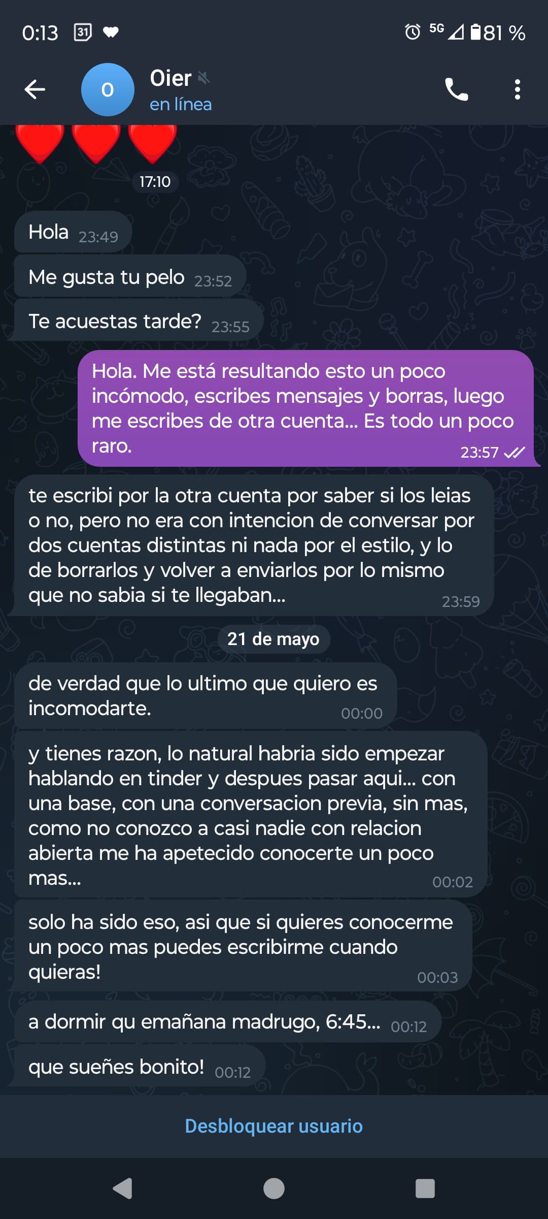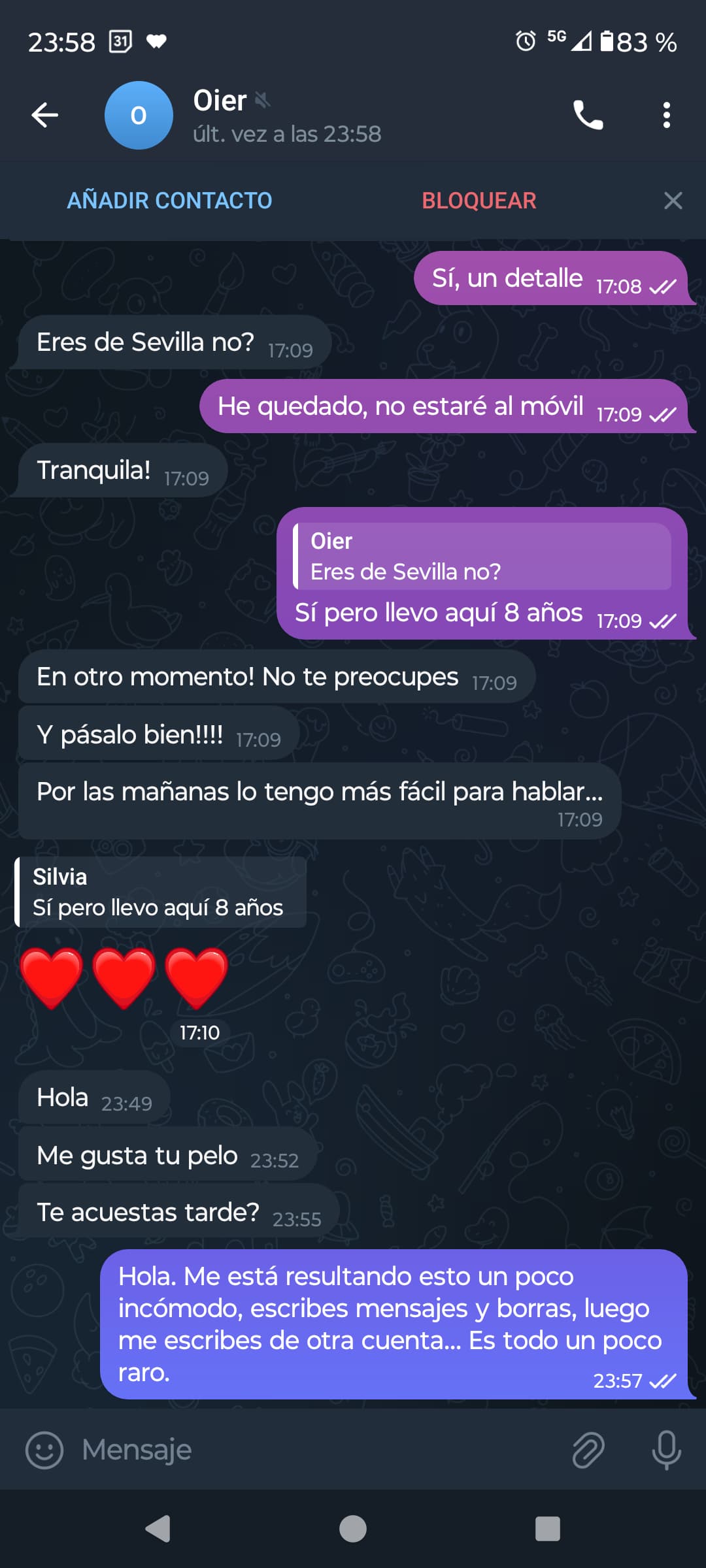 Empezó a escribirme como de forma insistente (me salían los mensajes en previsualizar) y luego entraba y había borrado. Me escribió desde otra cuenta de Telegr4m… me dijo cosas como me gusta tu pelo, todo muy raro.